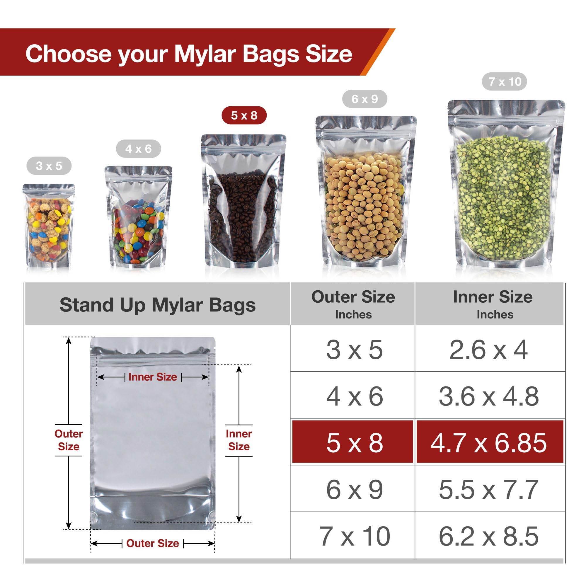 - Ultimate Space Saver: Pack of 100pcs small stand up Mylar bags (5”x8”) with 2 label sheets; each has 48 stickers