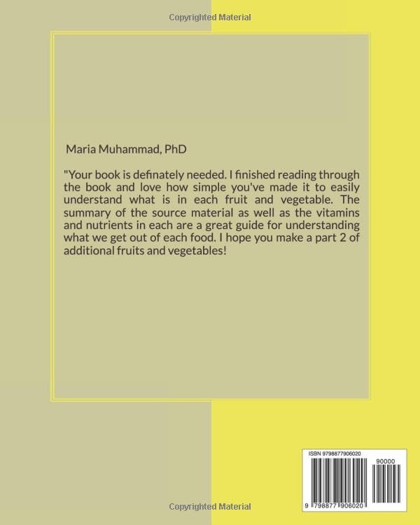 The nutritional facts were researched from the United States Department of Agriculture Food Data Central website. The Food Data Central is an integrated data system that provides expanded nutrient profile data and links to related agricultural and experimental research. The author researched the health benefits of various fruits and vegetable from various scientists and scholars. This guide provides references where the reader can do further research about the benefits of each of the fruits and vegetables.